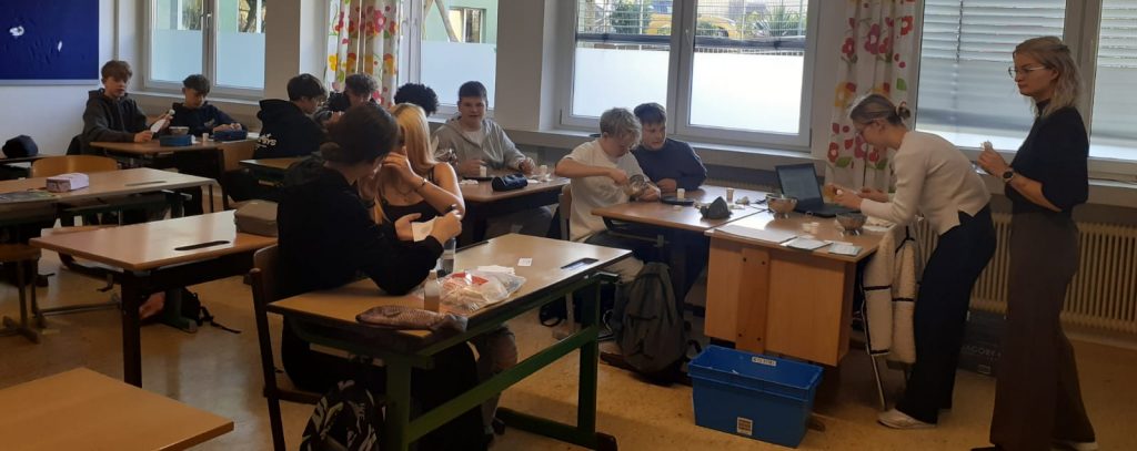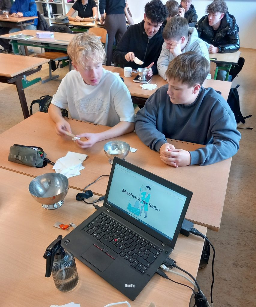 Mitarbeiter der Delphin Apotheke Schärding zu Gast in der PTS Schärding. Es wurden den SchülerInnen die Lehrberufe PKA und PTA nähergebracht. Im Zuge dieser Lehrberufsvorstellung konnten unsere Schüler auch selbst eine einfache Salbe herstellen.